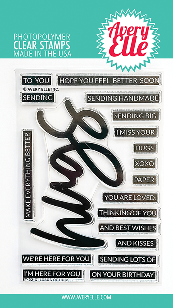 It comes with a large scripted "hugs" sentiment (4 1/8" x 2 1/2") and 18 sentiment strip stamps that coordinate with the word "hugs" in a variety of ways.