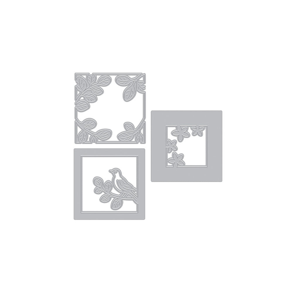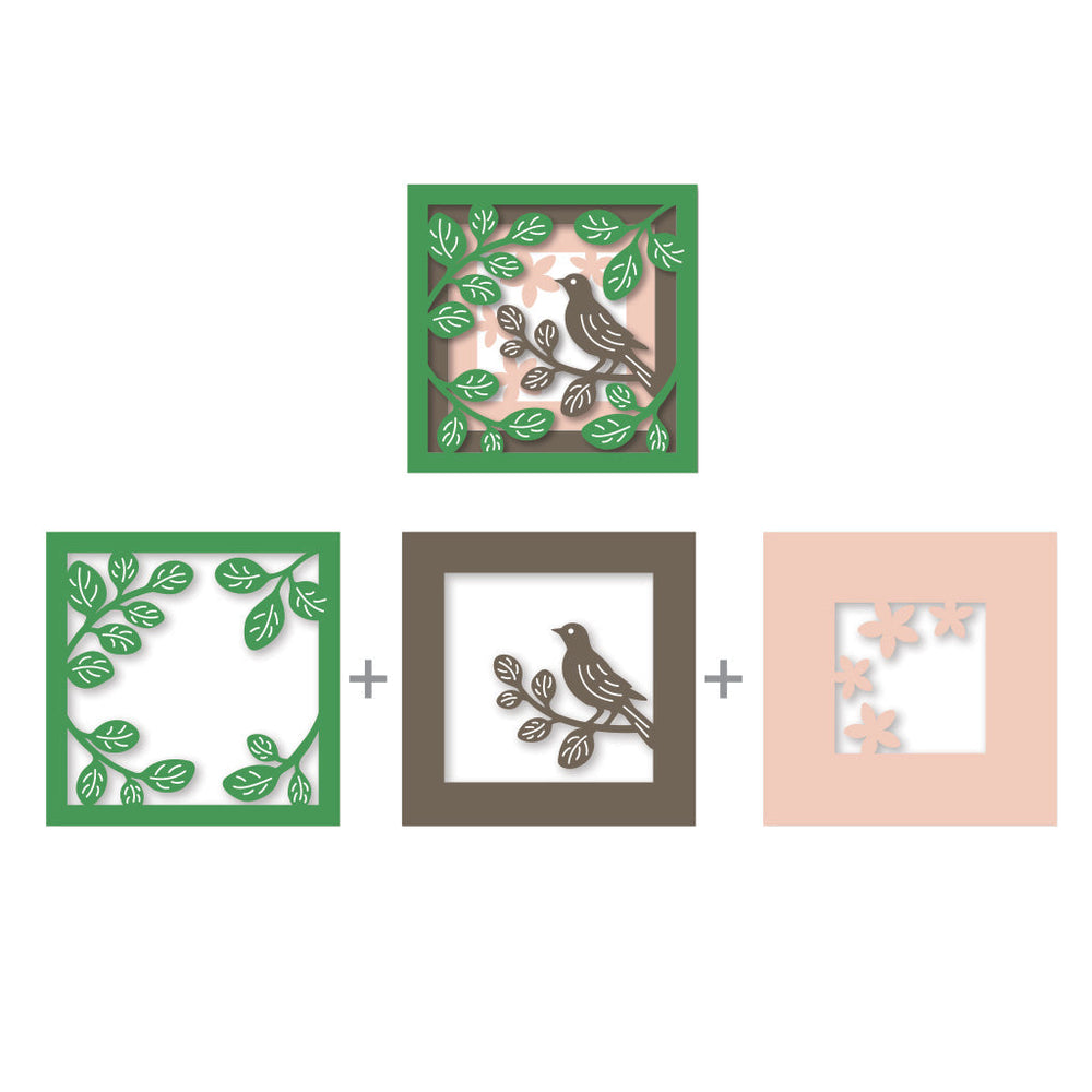 There are 3 dies in this set: a die with leafy branches, one with the bird on a branch, and a die with four flowers. Each die in this set has a thick frame that nests within the other layers. The end result is a multi-dimensional framed picture with the bird, leaves, and flowers.