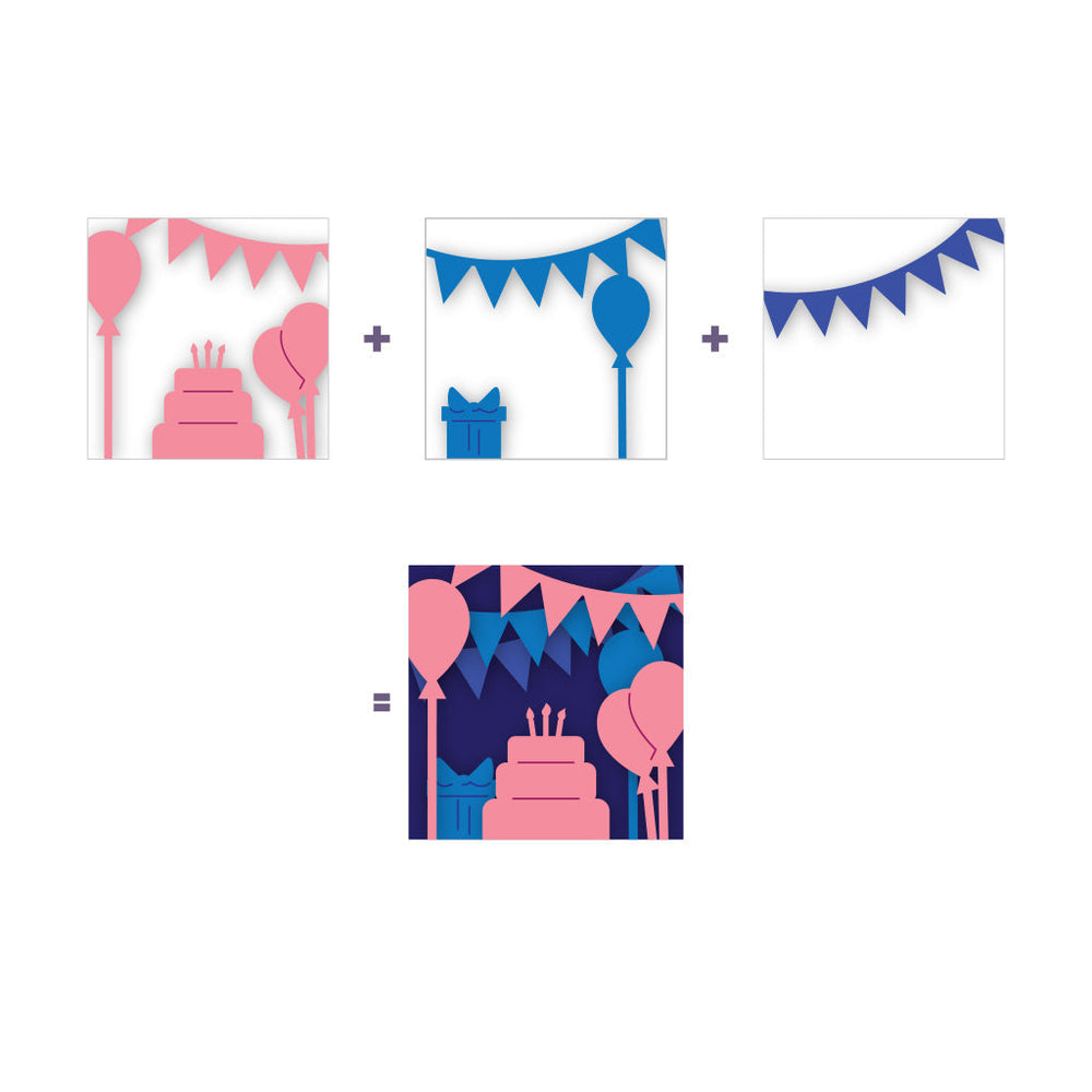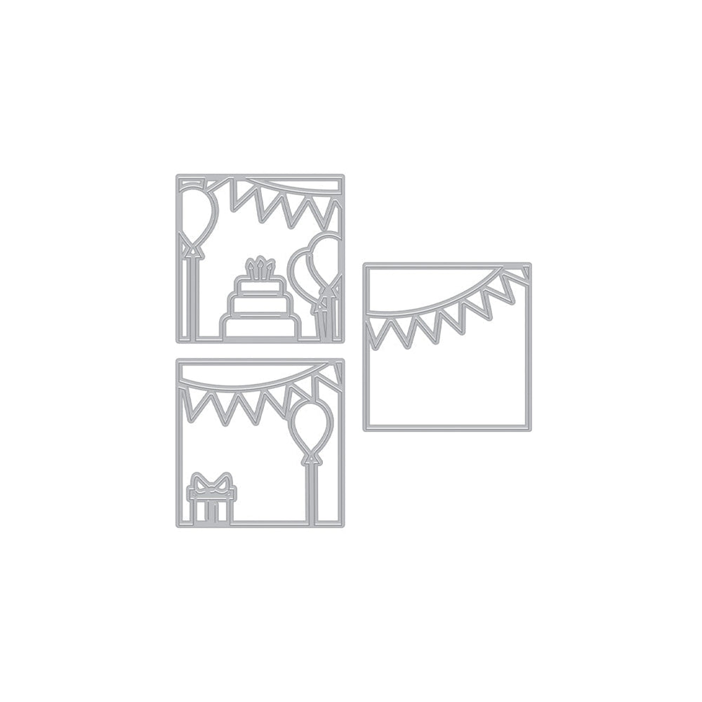 There are 3 dies in this set: a die a pennant banner, one with balloons and a tiered cake, and one with a balloon and gift. Each of the dies has a pennant banner streamed across the top, so that there is a really cool layered banner effect when all three scenes are put together!
