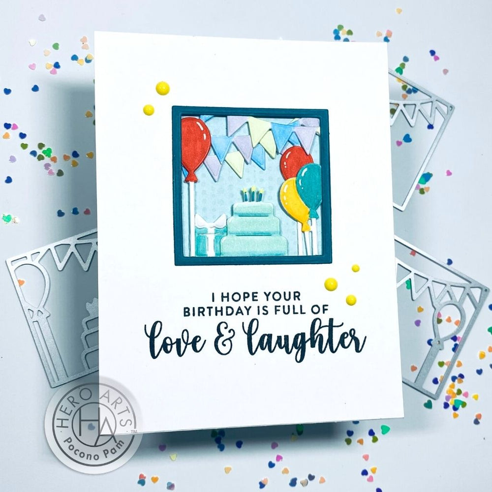Part of the Hero Arts Looking Glass Collection, this die set creates a festive 3-dimensional party scene that's fit for a celebration! It can be for birthday, anniversary, graduation, baby shower--you name it!