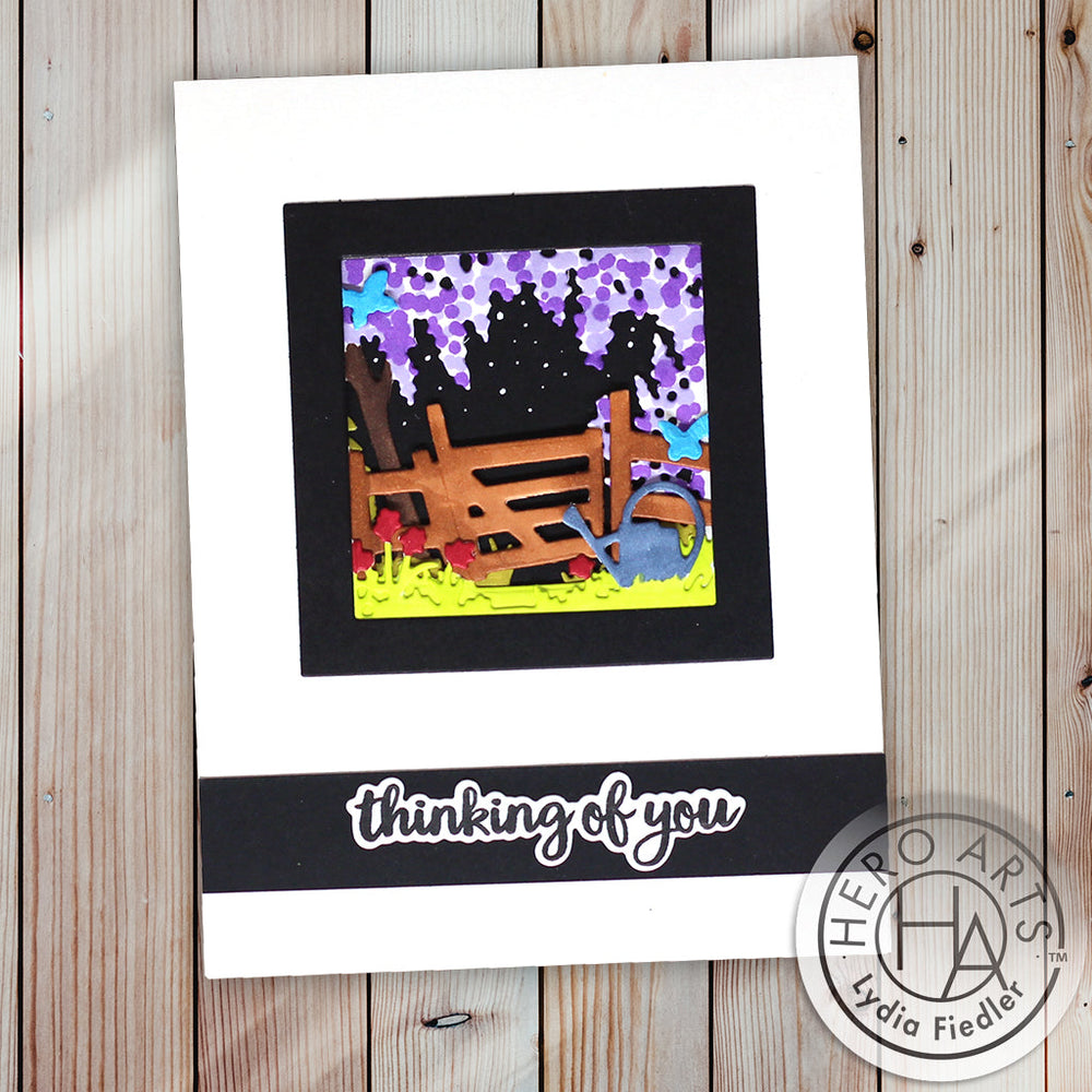 Part of the Hero Arts Looking Glass Collection, this die set creates a rustic 3-dimensional grassy meadow scene with lush trees, a farm gate, and watering can. The end result is a serene picture that can be used for all occasions.