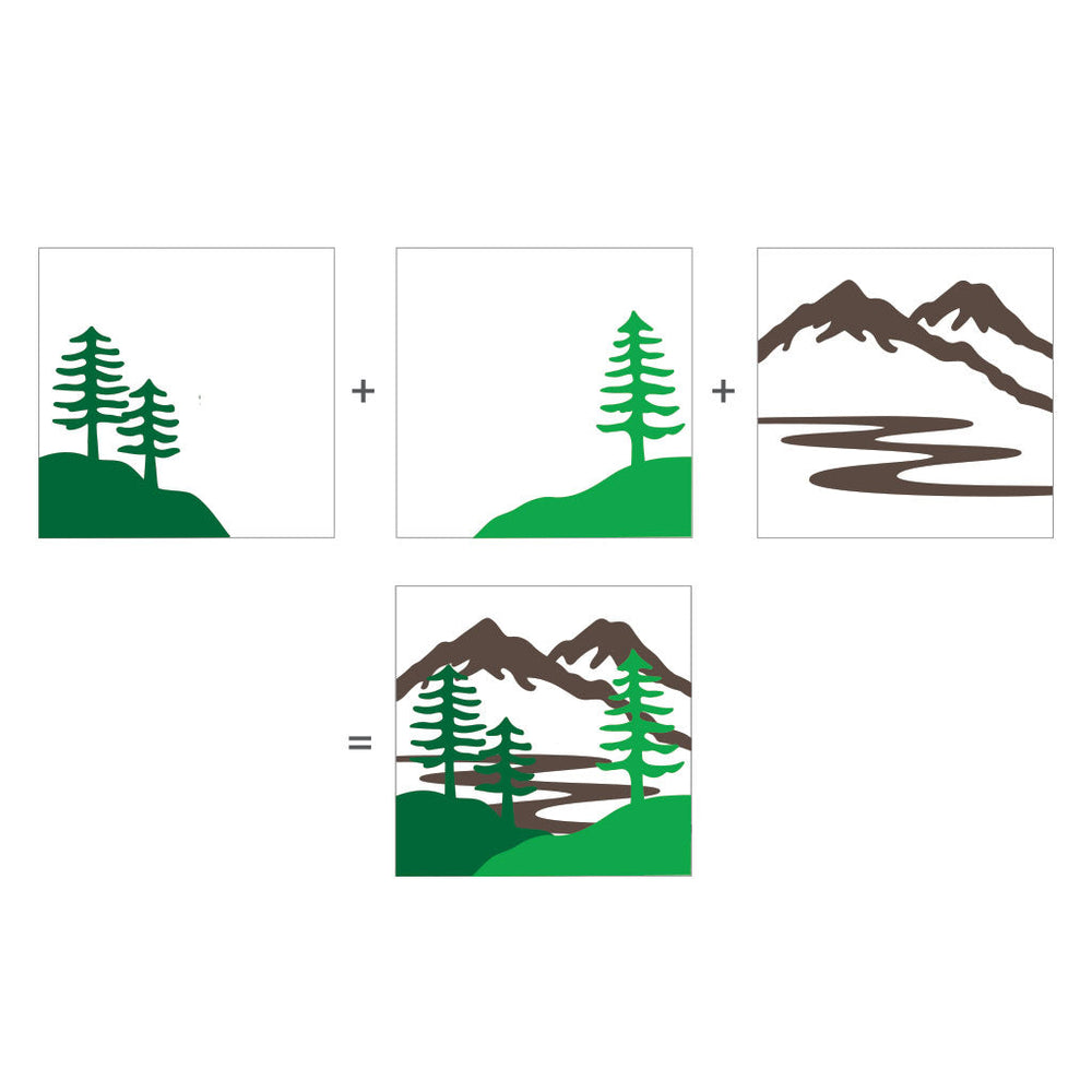 There are 3 dies in this set: one with two trees on a hill, one with a tree on a hill, and one with capped mountains and a winding river.