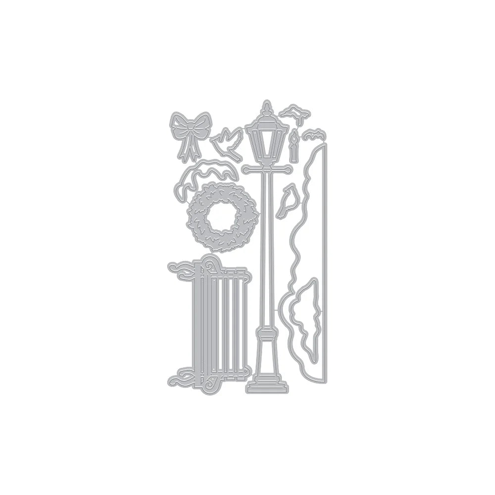 This die set layers together to create a lovely winter street scene! There's a street lamp, and a wreath, candles, snowy pile background, and bench. Additional details complete the look!
